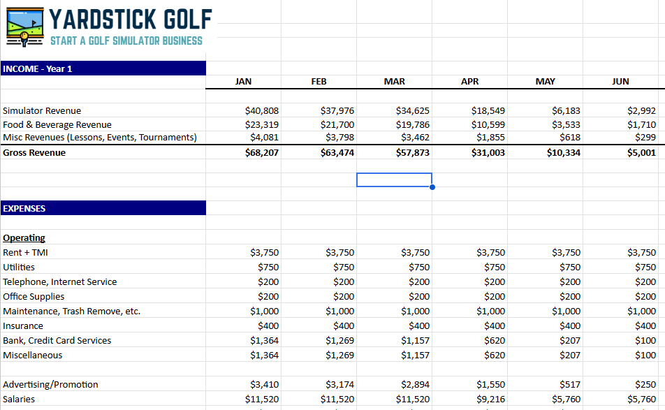 We have data on golf simulator utilization by month from real businesses. You can use this to forecast conservative or aggressive scenarios for planning purposes.