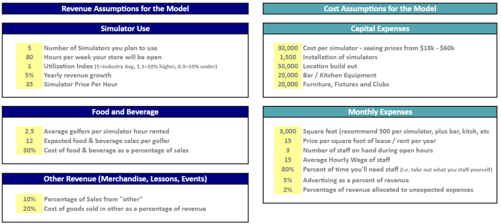 We took all the information from our indoor golf study and put it into a robust startup model in Excel. It also includes a 3 year summary financial projection for your golf simulator business based on the input you provide along with detailed monthly forecasts for years 1 through three on separate tabs. Each is formatted and ready to print to make it easy to use with your bank, investors or business plans.