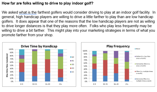 It all starts with the Indoor Golf Study. We’ve done extensive surveys of golf simulator businesses. The Indoor Golf Center study is a valuable tool for prospective golf simulator bar owners and investors. In addition to detailed analysis factors driving golf simulator choices, indoor golf visitor volumes by month, frequency of golfer visit, composition of revenue and future plans, the indoor golf study provides straight forward metrics to plan your business