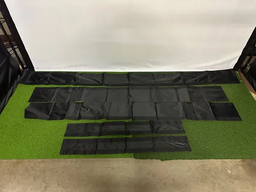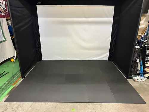 The landing turf was where I really went budget. Harbor freight had some good anti-fatigue mats on sale. A 4 pack of 25×25 interlocking squares with removable edge pieces for $13 each (I did 5 packs to cover 8×10). On top of that I used the Project Source 8 x 10 (ft) needle punch polyester green area rug at Lowes for $45 (I wanted to get the Grizzly Grass but it was out of stock). All in $125. Putts pretty well, looks ok, and is a nice inexpensive landing pad for my sim.