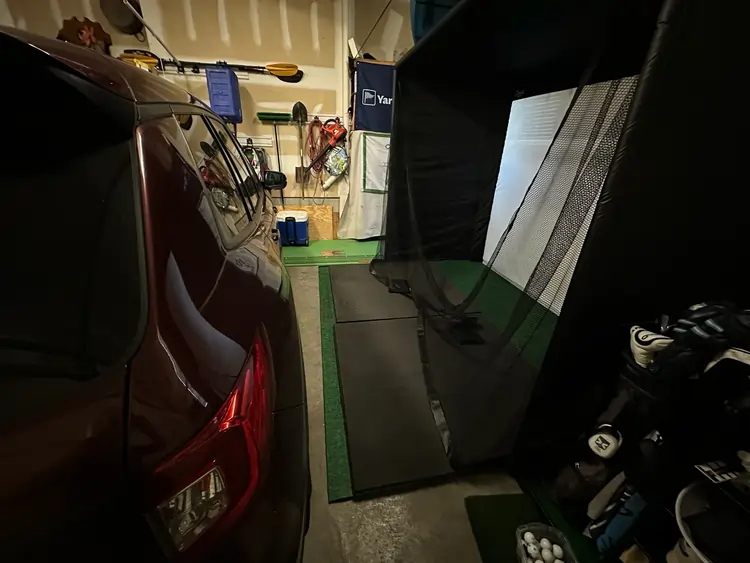 When the simulator’s not in use, the enclosure sits along the side wall, the mat is folded up, and there’s a clear path for the car to pull straight in. It takes about 30 seconds to flip the mat back down and we’re ready to hit balls.